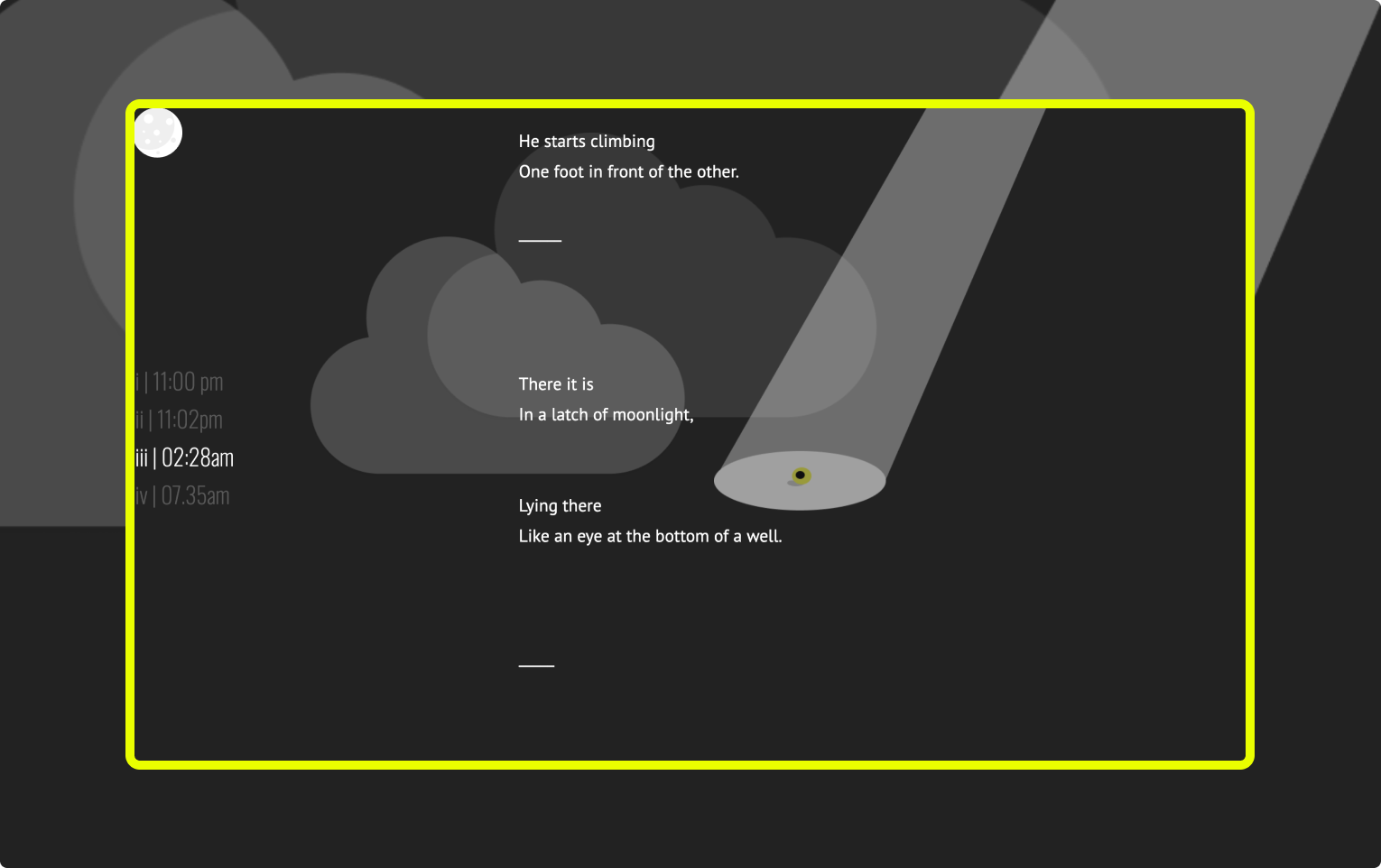 I write a lot of poetry and I am interested in interactive digital narratives. This was a short piece that I am planning on expanding in the future that let me explore interaction and animation, as well as the UX of reading and engaging with a digitla text.