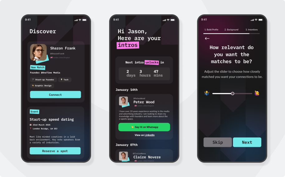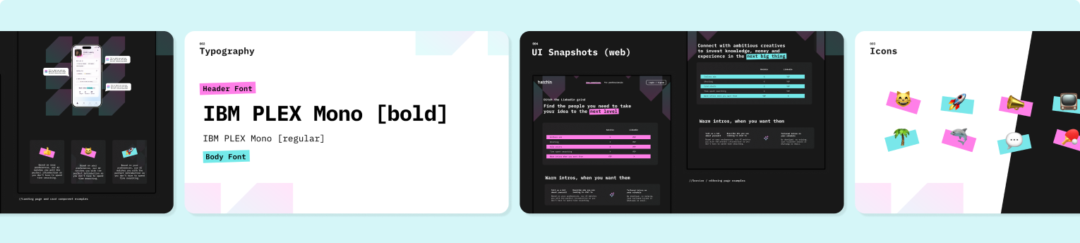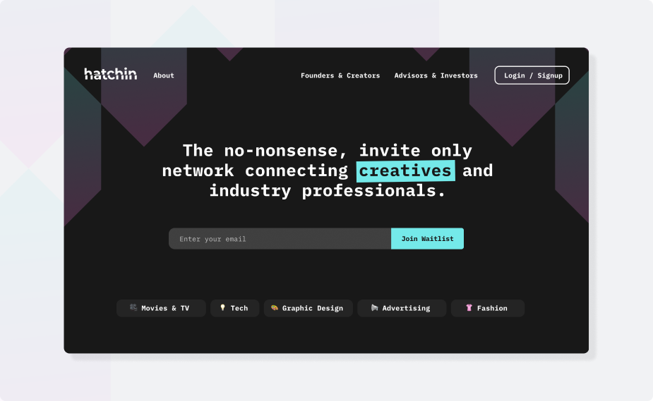 I worked with the founders of Hatchin to take their idea for a minimal, distraction free networking platform from 0-1 to secure funding. I created a brand identity and designed wireframes of their website and app in figma. I built their website in webflow and worked closely with their FE developer to build a prototype app that sold their vision and helped them secure their next round of funding to take the project to the next level.