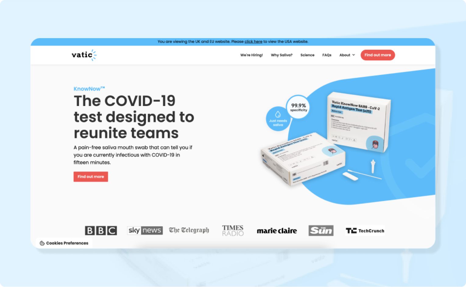 I was the founding designer for Vatic Health. During the COVID-19 pandemic they produced a unique saliva based infectiousness test for COVID-19. I was responsible for branding, web design, and the UX of the test, instructions and companion app. Vatic Health was acquired in 2022.